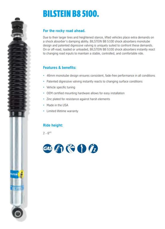 The 5100 Series offers traditional Bilstein technology with applications for lifted trucks, Jeeps and prerunners. Our 5100 Series shock absorbers are designed for specific manufactured lift kits utilizing the stock O.E.M. mounting configuration. 5100 Series shocks feature Bilstein’s superior single tube high gas pressure design for the upmost in consistent fade-free performance and long life. Bilstein’s patented Digressive self-adjusting valving delivers improved damping control and a smooth ride on all road surfaces at any speed.