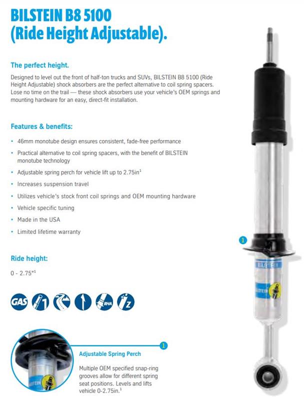 Bilstein is world famous for manufacturing some of the most durable, longest lasting shocks available. In fact, the 5100 Series shocks are comprised of components originally designed or off-road motorsports. Bilstein is so confident that these shocks will out last your vehicle that they back the product with a Limited Lifetime Aftermarket Warranty. If a Bilstein shock fails during normal wear and tear, you’ll get a new shock absolutely free.